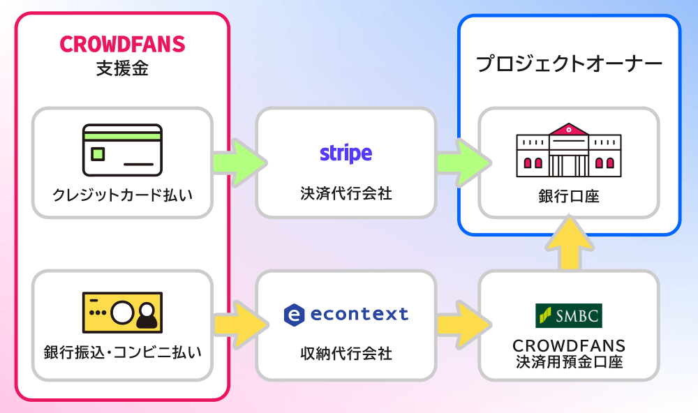 支援者 → econtext(収納代行会社) → CROWDFANSの決済用預金口座 → プロジェクトオーナーの銀行口座