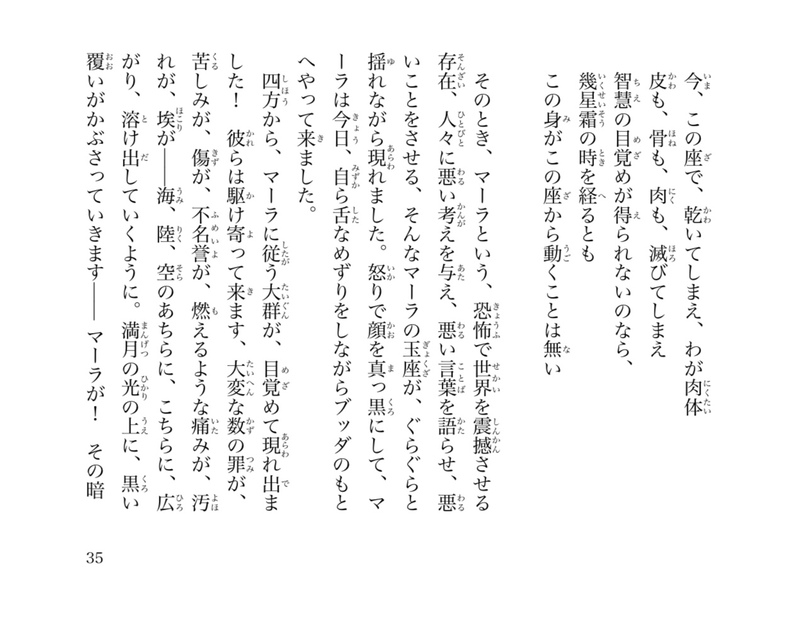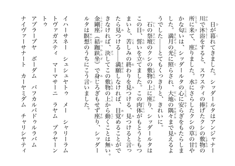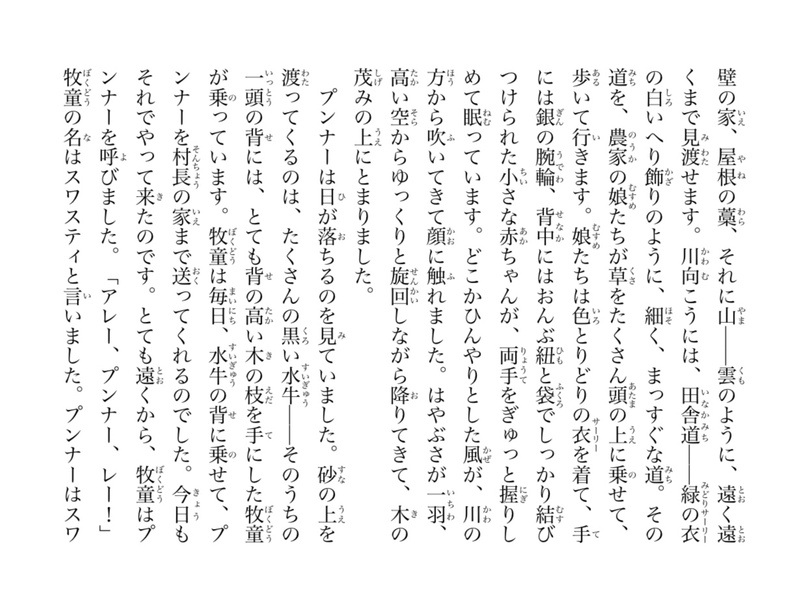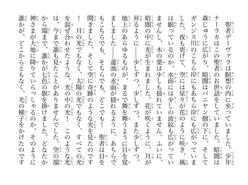 とにかく美しい詩文なので、歌でも聴くような気持ちで読めるものを、と訳しました。子ども向けと言っても、平仮名ばかりにするのも違うなと思い、かと言って大人でないと読めないのもおかしいので、最終的に、ほぼすべてに振り仮名を振るという形を取りました。子どもの頃、漫画の振り仮名で漢字を覚えたようなところがあります。大人の皆さまには逆に読みづらいかもしれませんが、ご寛恕ください。
