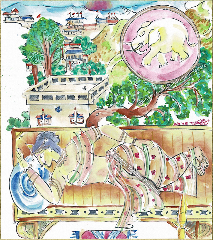 このように画家として名高いアバニーンドラナートですが、すぐれた文学者でもあり、特に児童文学の分野で何作も語り継がれる名作を紡ぎ出しました。音楽にも長けていて、エスラジやシタール、リードパイプなどの演奏に優れ、更にラビーンドラナート・タゴールの戯曲の舞台美術を担当したり、役者として出演もしていました。