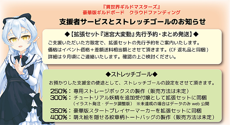 先ほど投稿した「支援者サービスとストレッチゴールのお知らせ」に関しまして
